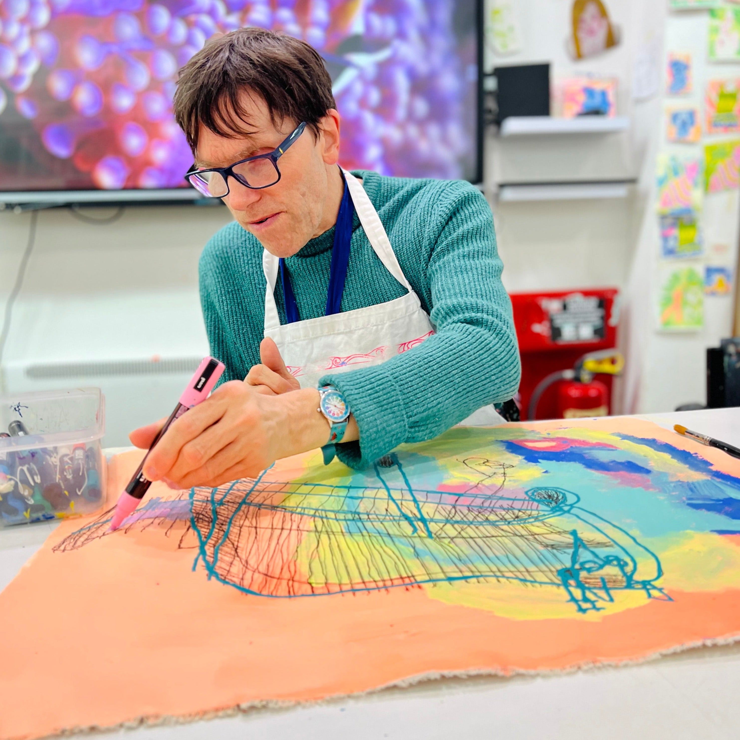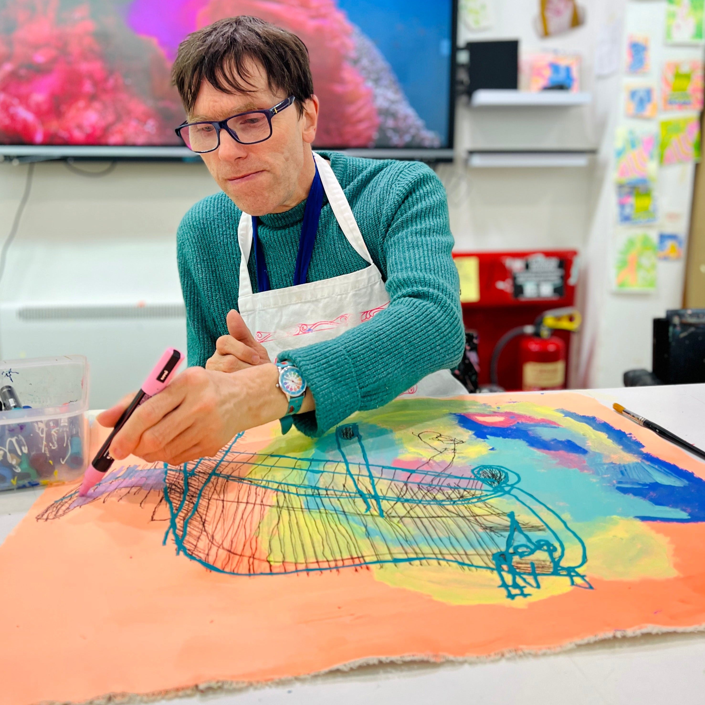 Simon’s uniquely expressive work has become an essential part of ARTHOUSE design throughout his long and accomplished career. Working with incredible focus and energy, he carves bold figures and animals bursting with life. His drawing is built by layering lines from the inside to out.