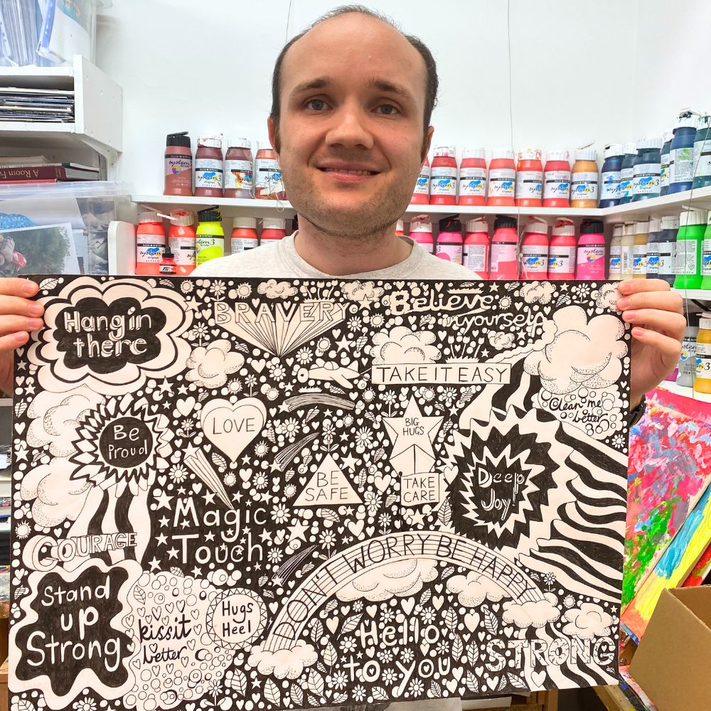My name is Jack, I’ve been coming to ARTHOUSE for a while now. I love coming to ARTHOUSE because I do lots of artwork and I like drawing cartoons to relax. I enjoyed designing and painting the tropical trio and donkey disco paintings. It’s nice to learn new skills and stretch my ability. I feel blessed when I see my artwork on products in the shop. It makes me feel really proud being part of the ARTHOUSE, I created the gold frame design on the labels for all the products so my work is represented on everything at ARTHOUSE.
