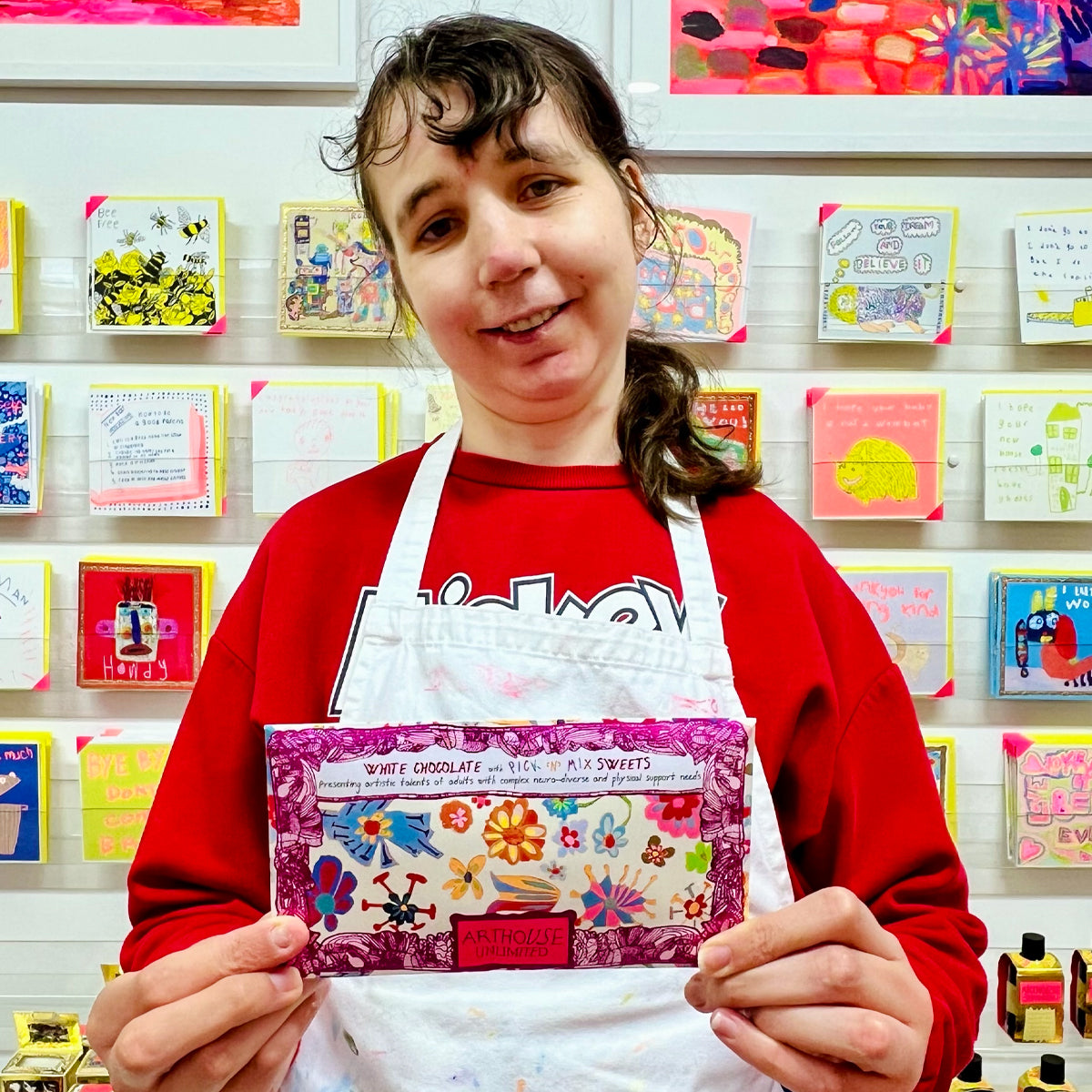 I really enjoy coming here as we all work together. I am an artist and cashier, I love serving customers and showing them my artwork I enjoy coming to Arthouse Unlimited I love all the work I’ve done here, it is all fantastic. I love using my imagination, drawing flowers and fantasy animals all bright and colourful.