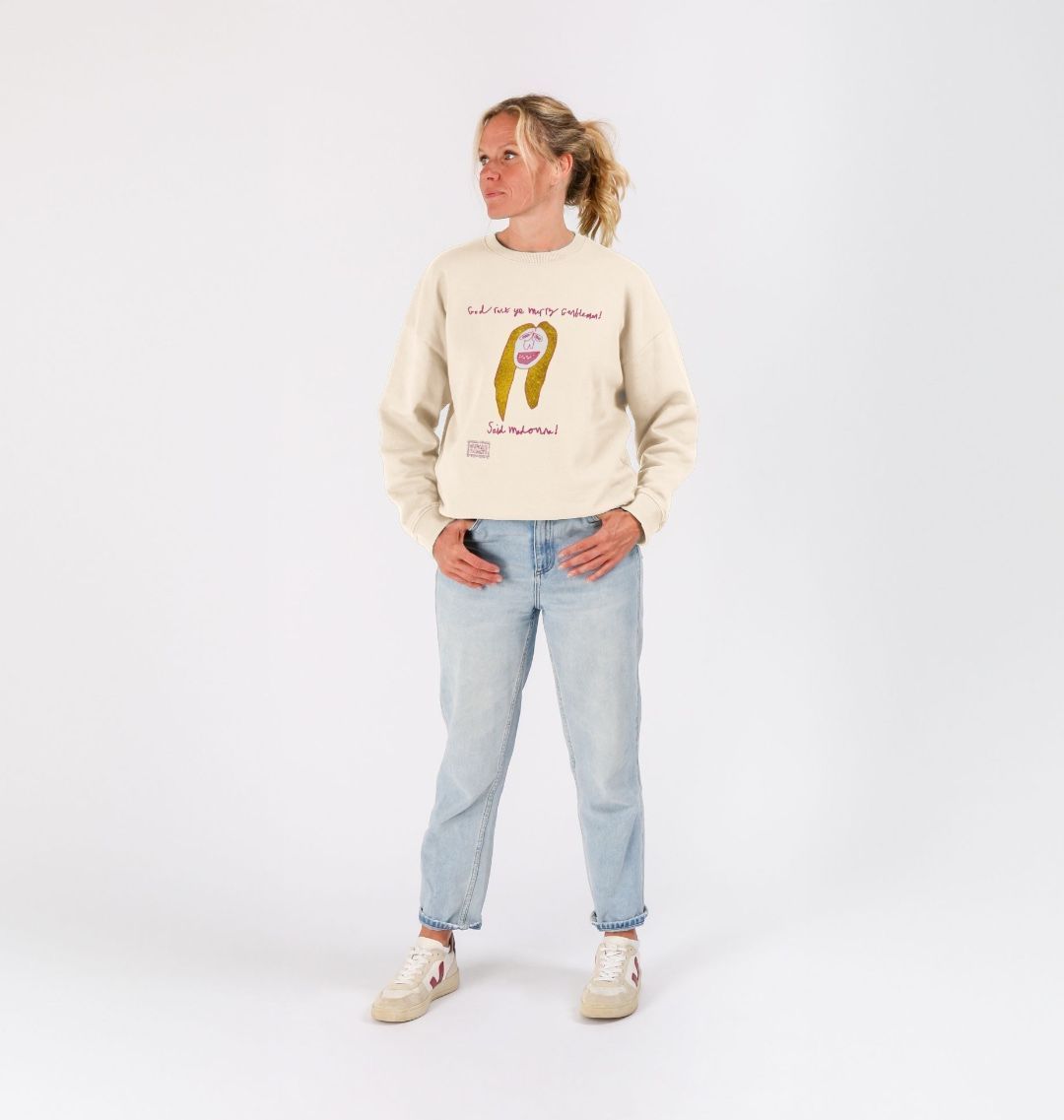 Certified Organic Cotton Relaxed Fit Sweatshirt, 300g/m2. Wash cool, hang dry. GM free. Not tested on animals. Does not contain animal-derived products. Printed in the UK with low waste printing tech. Made in a renewable energy powered factory audited for a wide range of social and sustainability criteria.