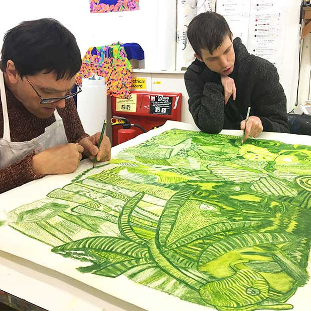 The 'Abundance of Love' original artwork is a celebration of the inspiring and wonderful world around us. It brings together the artists’ collective interest in conservation and the joy that nature brings into the studio. Each artist chose different elements of the Rainforest for their individual line drawings - from trees and leaves, to toucans and monkeys. These individual elements were then assembled into a large scene which then became two incredible individual original artworks in tones of green pencil.