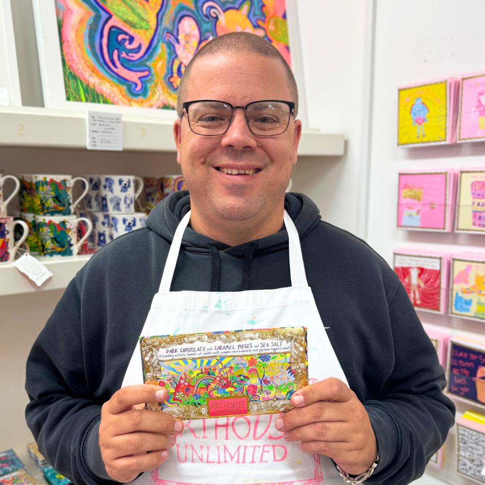 Wrapped in coloured foil & encased in a recyclable envelope, this bar features the ARTHOUSE Unlimited artists original Joy Revolution artwork presented in a shimmering gold frame.