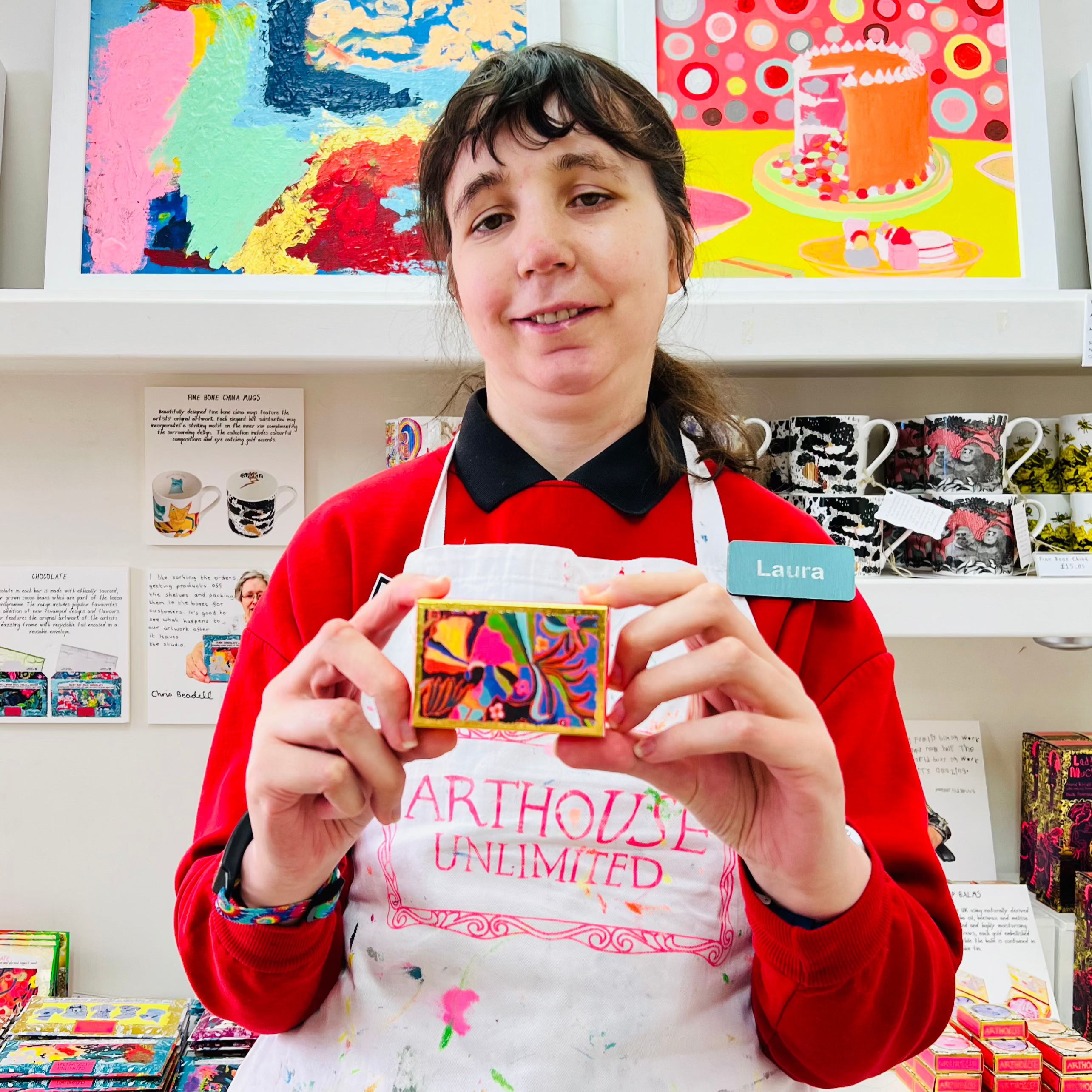 I really enjoy coming here as we all work together. I am an artist and cashier, I love serving customers and showing them my artwork I enjoy coming to Arthouse Unlimited I love all the work I’ve done here, it is all fantastic. I love using my imagination, drawing flowers and fantasy animals all bright and colourful.