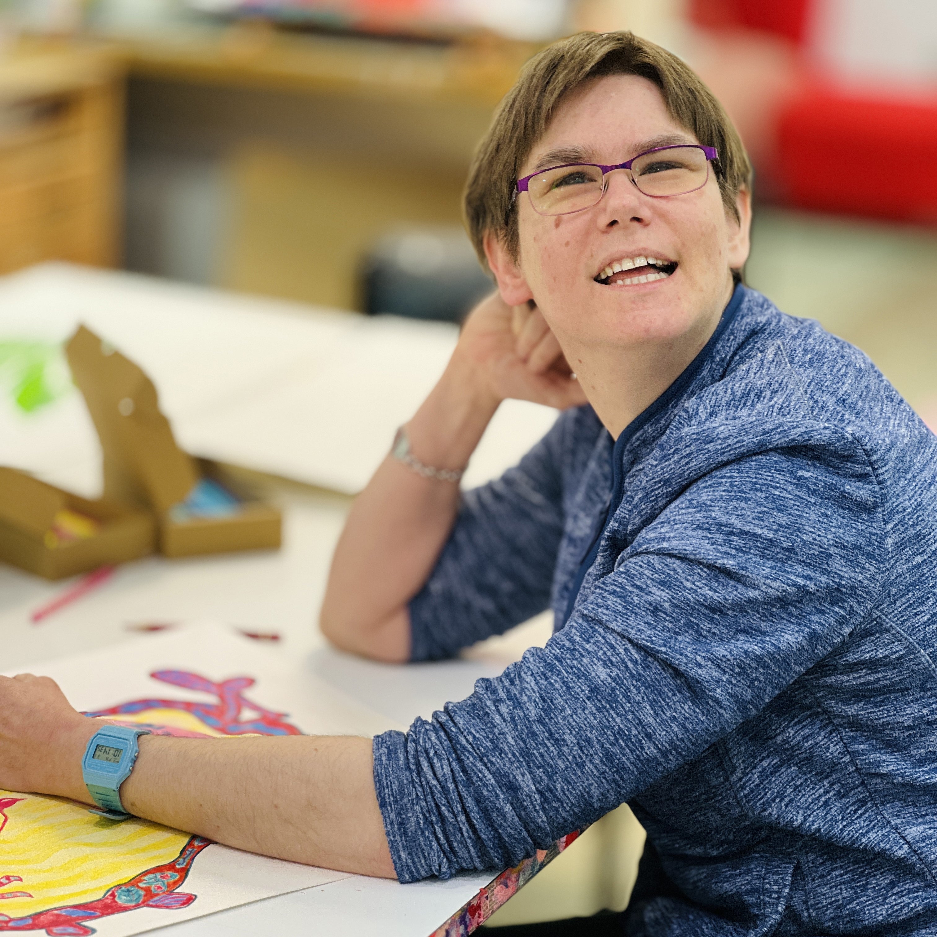 This beautiful artwork was completed as part of a project in the studio focusing on colourful birds in pencil on paper. Every artist created their own individual birds drawings and everyone worked together to add colour and energy to each piece.