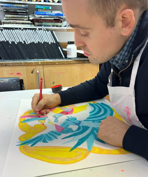 This beautiful artwork was completed as part of a project in the studio focusing on colourful birds in pencil on paper. Every artist created their own individual bird drawings and everyone worked together to add colour and energy to each piece.