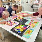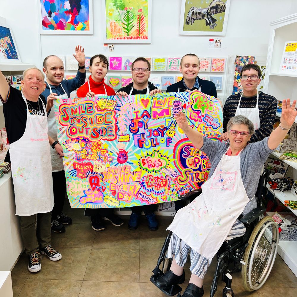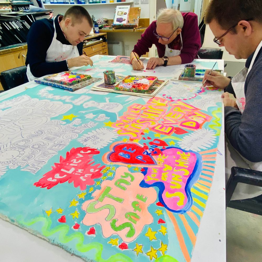 The Full of Joy artwork was originally started in lockdown over zoom with the artists bringing together sentiments and words of positivity to uplift and bring reassurance during a challenging time. When the artists came back together in the studio, the words and drawings were brought together in joyful colours, culminating in one giant artwork of positivity and joy.