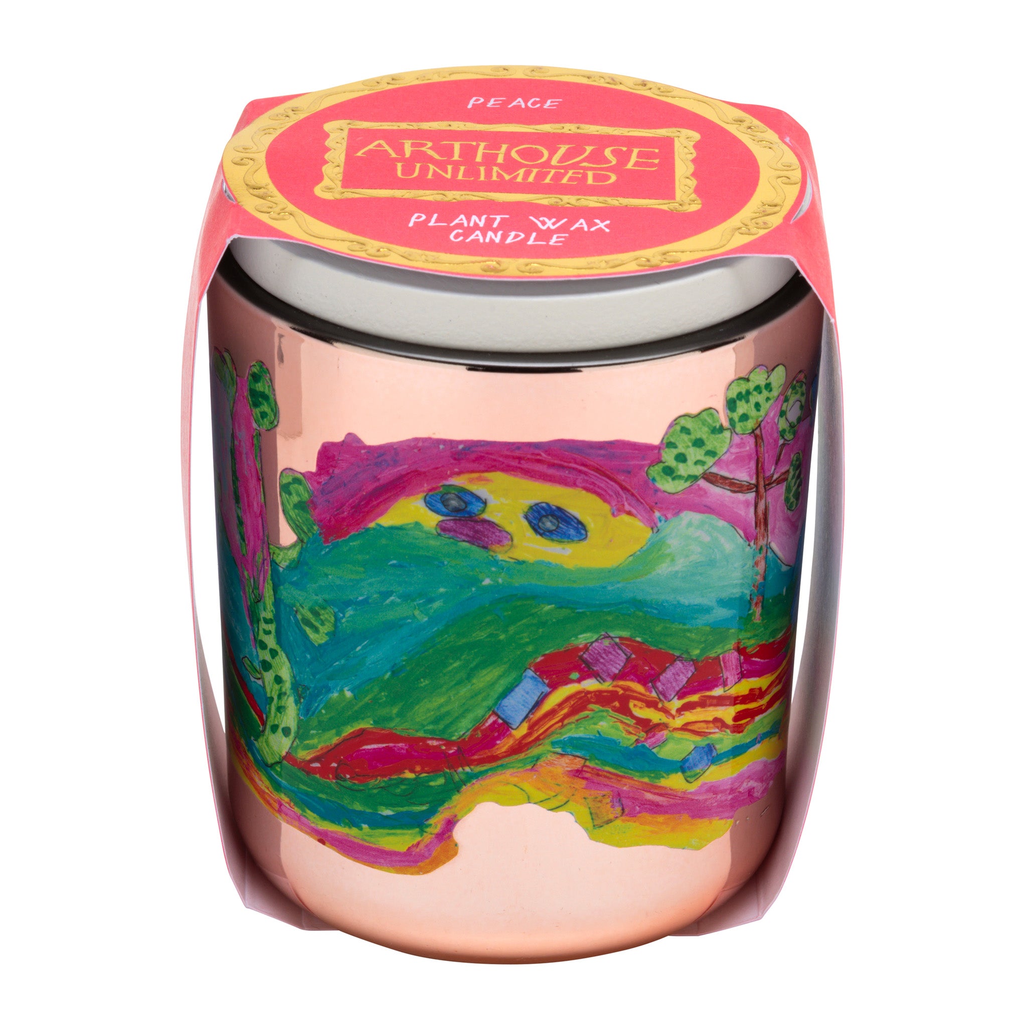 A uniquely fragranced vegan-friendly candle featuring the beautiful ‘Peace’ artwork created by talented ARTHOUSE Unlimited artist Laura Allen. The candle aroma evokes notes of Rhubarb, Tahitian and Vanilla. Made in the UK, this candle has 40 hours of burn time & the plant wax is hand poured into a re-useable highly decorative vessel. A timeless gift for art lovers, joy givers & good-cause supporters everywhere!