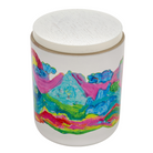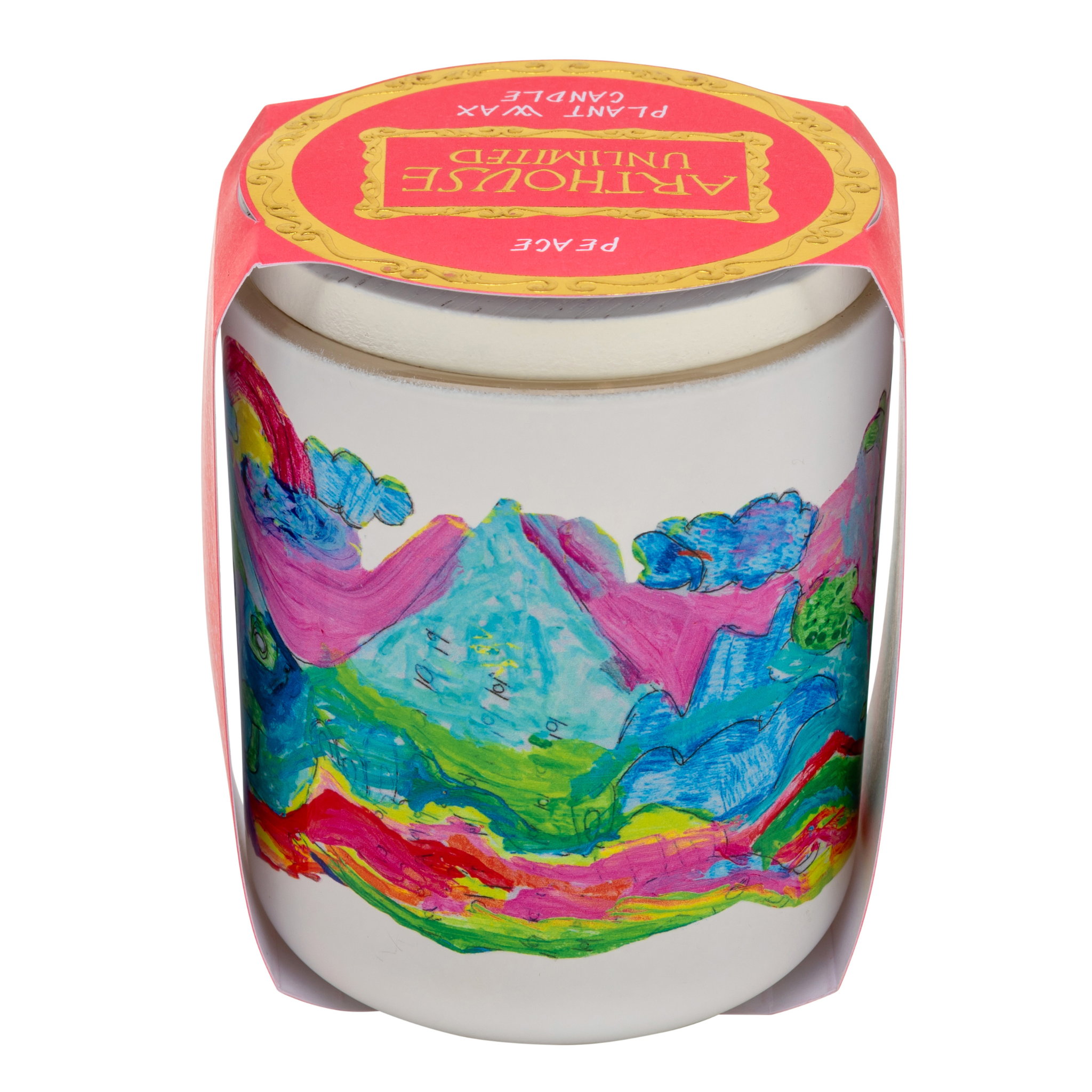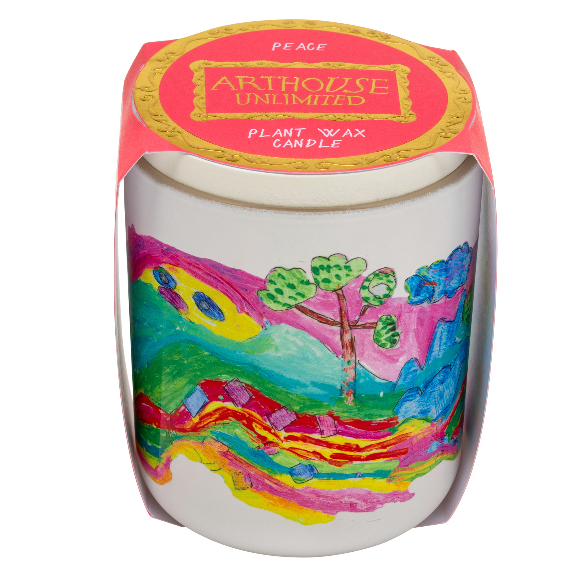 A uniquely fragranced vegan-friendly candle featuring the beautiful ‘Peace’ artwork created by talented ARTHOUSE Unlimited artist Laura Allen on white glass. The candle aroma evokes notes of Rhubarb, Tahitian and Vanilla. Made in the UK, this candle has 40 hours of burn time & the plant wax is hand poured into a re-useable highly decorative vessel. A timeless gift for art lovers, joy givers & good-cause supporters everywhere!