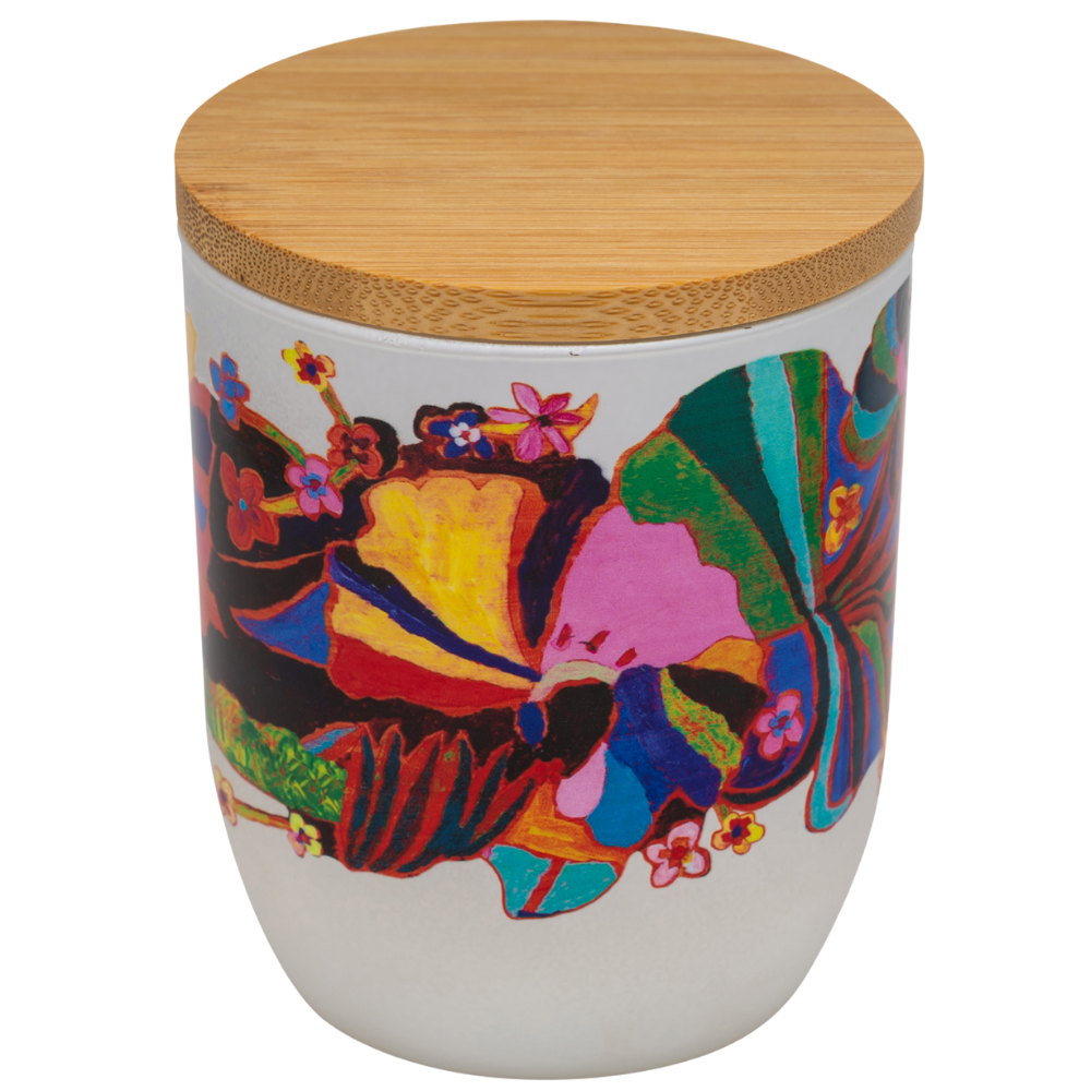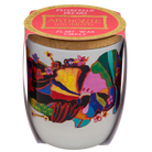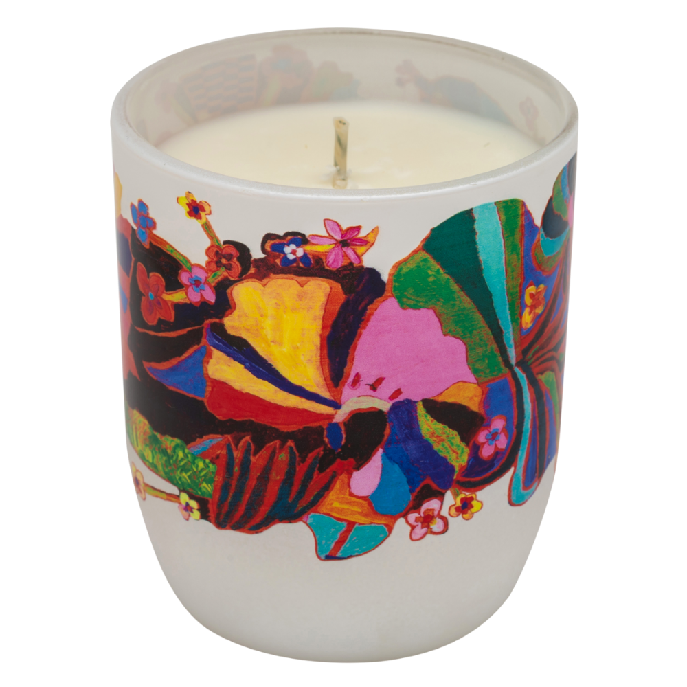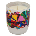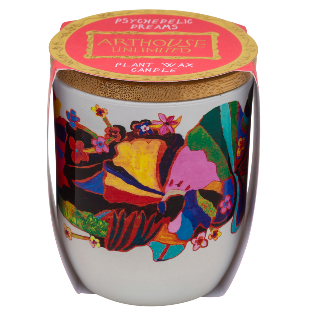 A uniquely fragranced vegan-friendly candle featuring the beautiful ‘Psychedelic Dreams’ artwork created by talented ARTHOUSE Unlimited artist Laura Tragellas on white glass.
