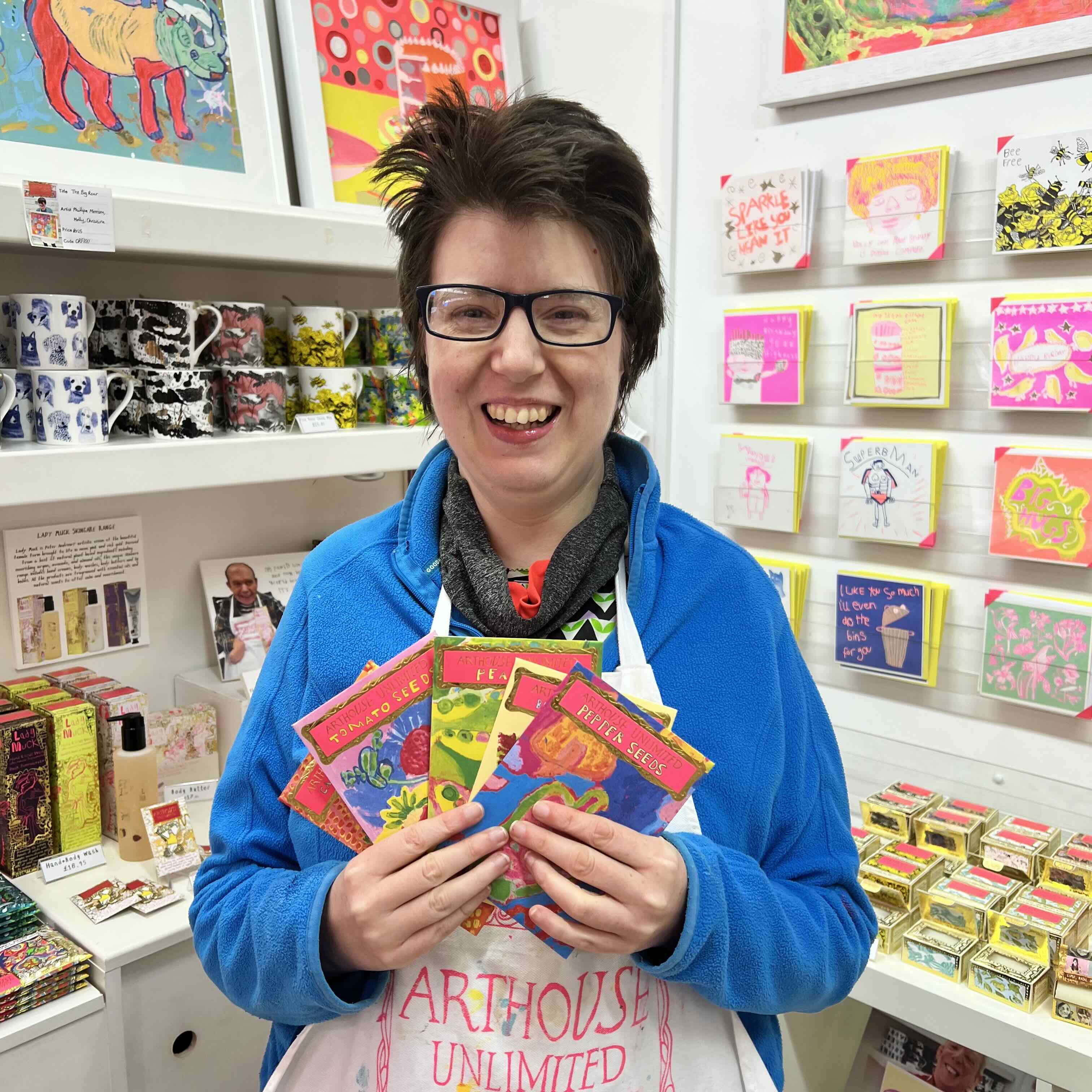 The colourful artwork for the Seeds packets arose from a project in the studio focusing on growing vegetables. The artists chose to paint or draw vegetables and fruit that they enjoyed to eat and came up with quotes about planting which are shown on the back of the packets.