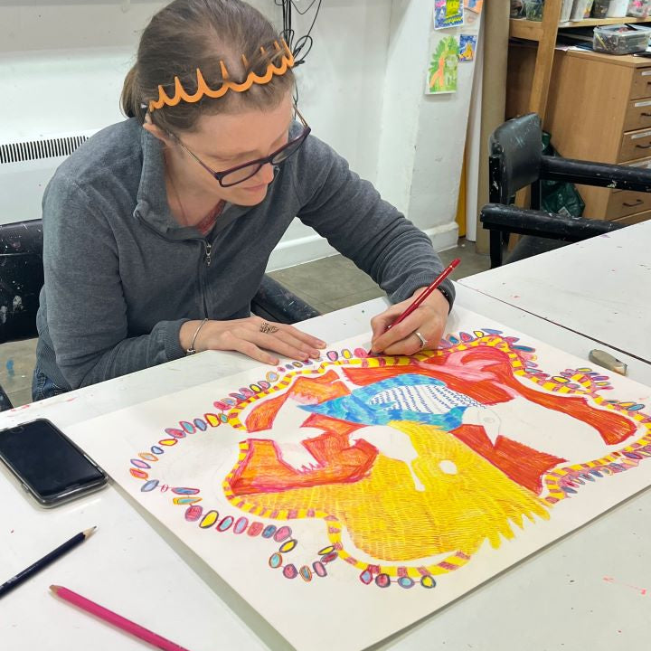 This beautiful artwork was completed as part of a project in the studio focusing on colourful birds in pencil on paper. Every artist created their own individual bird drawings and everyone worked together to add colour and energy to each piece.