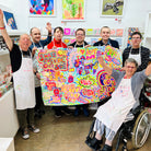 The Full of Joy artwork was originally started in lockdown over zoom with the artists bringing together sentiments and words of positivity to uplift and bring reassurance during a challenging time. When the artists came back together in the studio, the words and drawings were brought together in joyful colours, culminating in one giant artwork of positivity and joy.