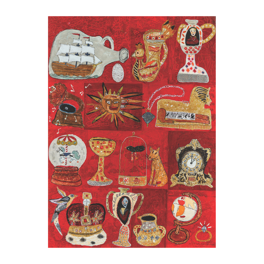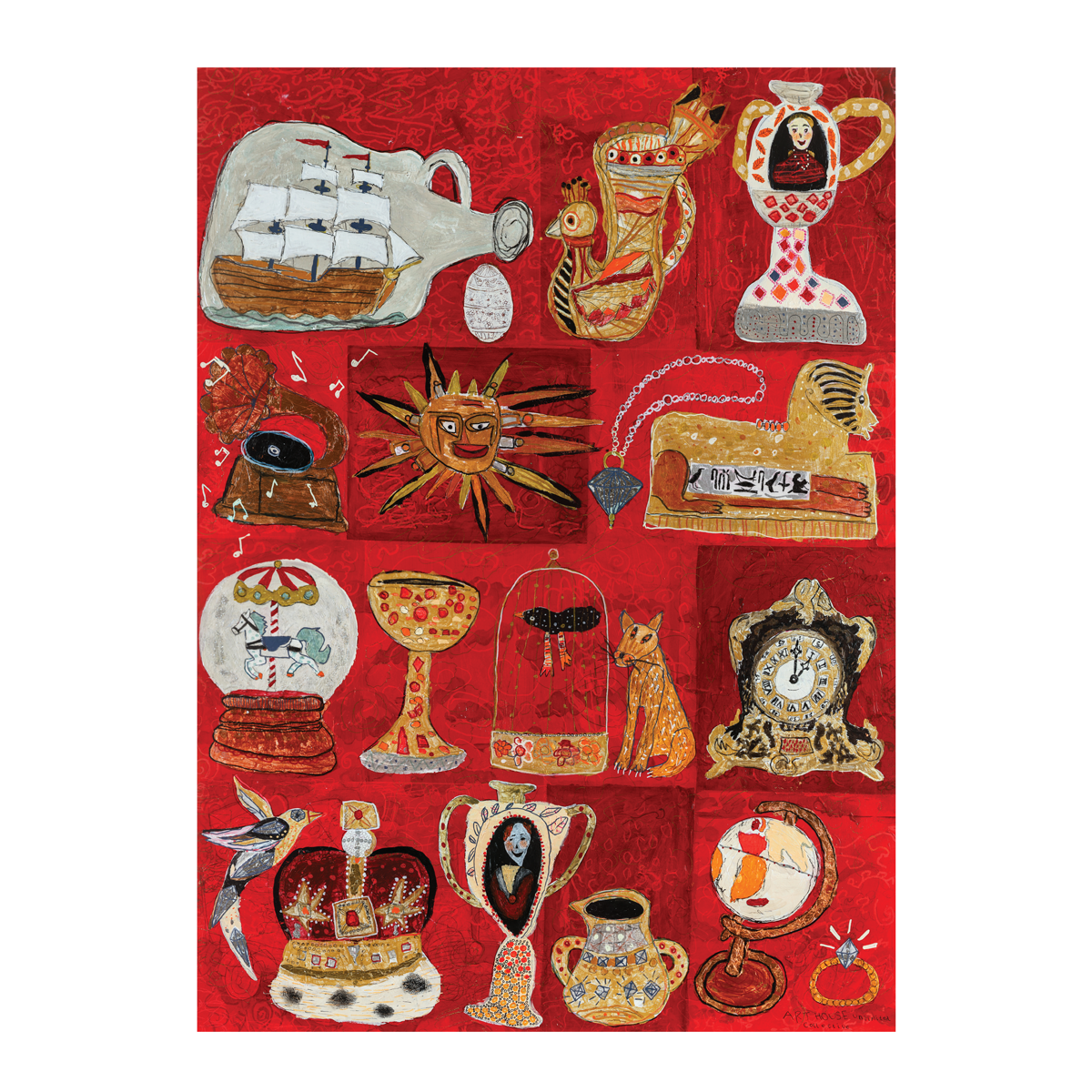 An eclectic mix of precious objects, collectively created by collaboration of artists and inspired by travels to magical places. A golden sphynx from Egypt, a Fabergé Egg from Russia and the Crown Jewels straight from the Tower of London, each illustration features incredible detail.