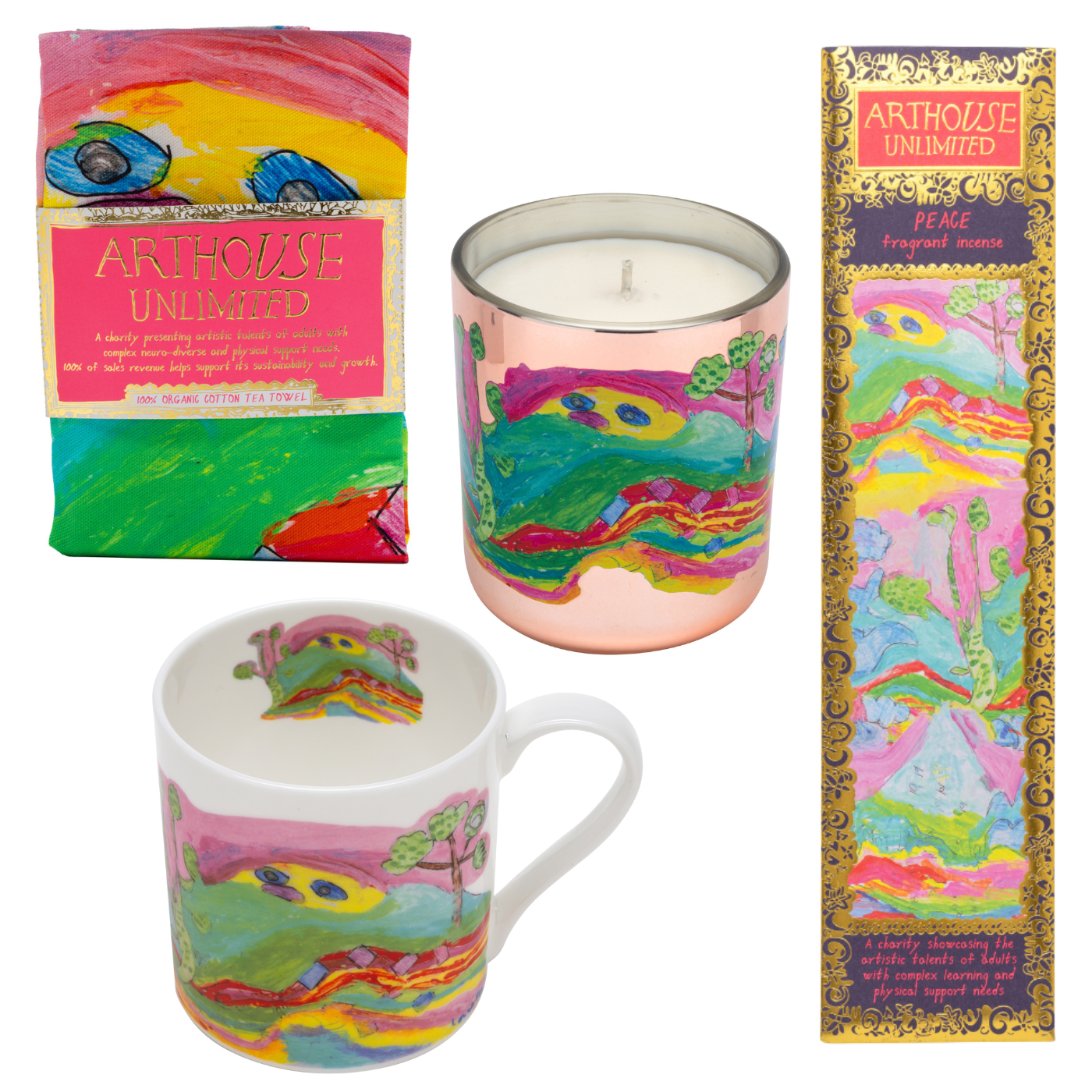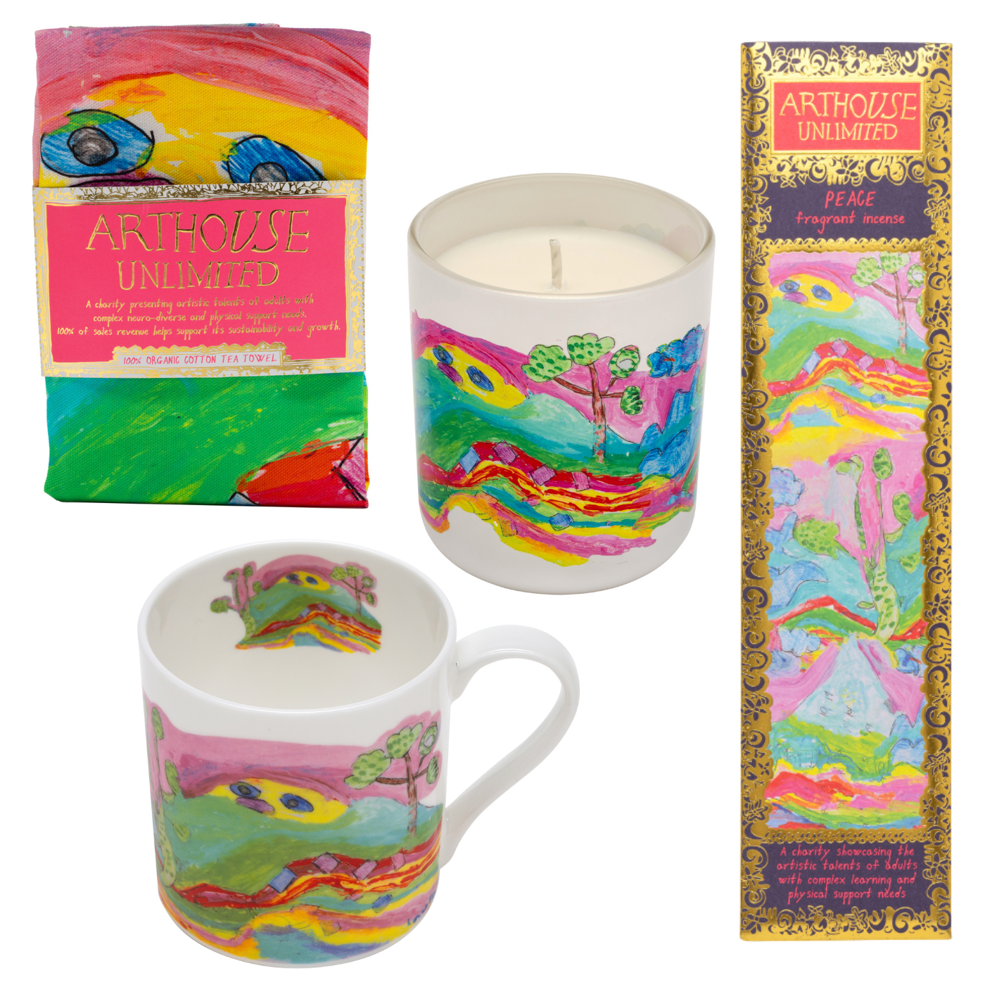 The Peace collection features colourful and abstract artwork of ARTHOUSE Unlimited artist Laura Allen. The candle and incense sticks are all fragranced with notes of Rhubarb & Tahitian Vanilla.