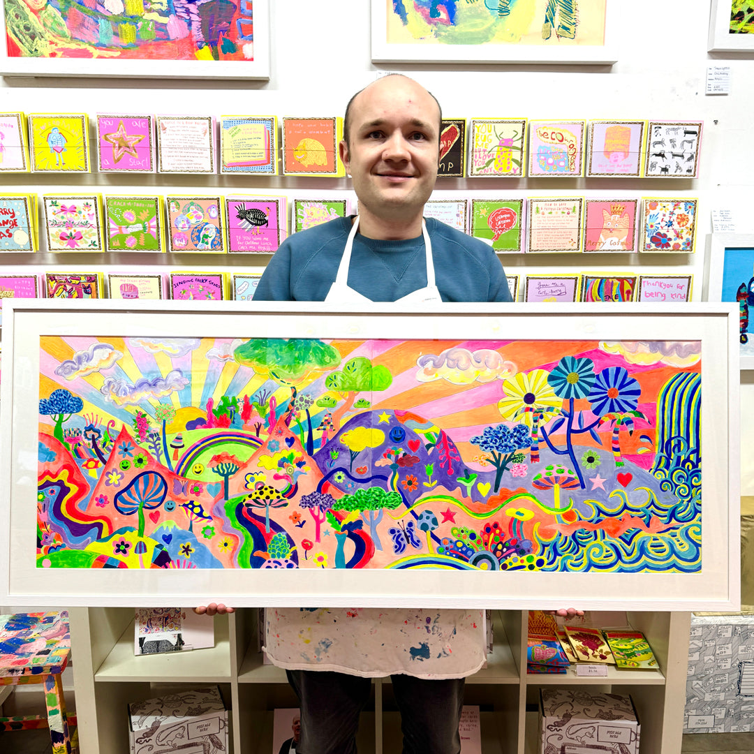 My name is Jack, I’ve been coming to ARTHOUSE for a while now. I love coming to ARTHOUSE because I do lots of artwork and I like drawing cartoons to relax. I enjoyed designing and painting the tropical trio and donkey disco paintings. It’s nice to learn new skills and stretch my ability. I feel blessed when I see my artwork on products in the shop. It makes me feel really proud being part of the ARTHOUSE, I created the gold frame design on the labels for all the products so my work is represented on everything at ARTHOUSE.