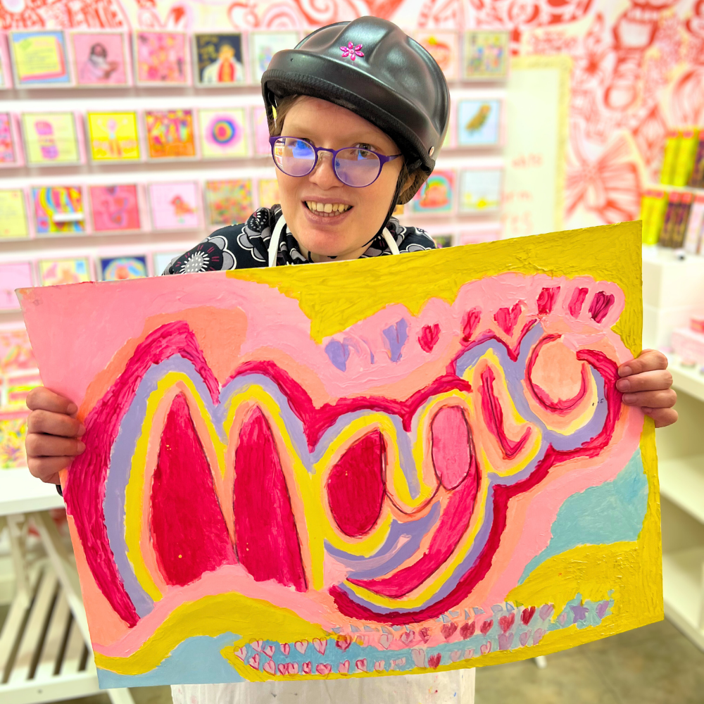 I like to paint with bright colours, which makes me feel happy. I am very proud of my art.