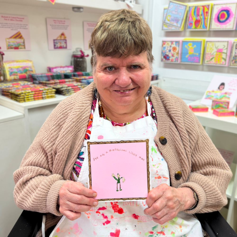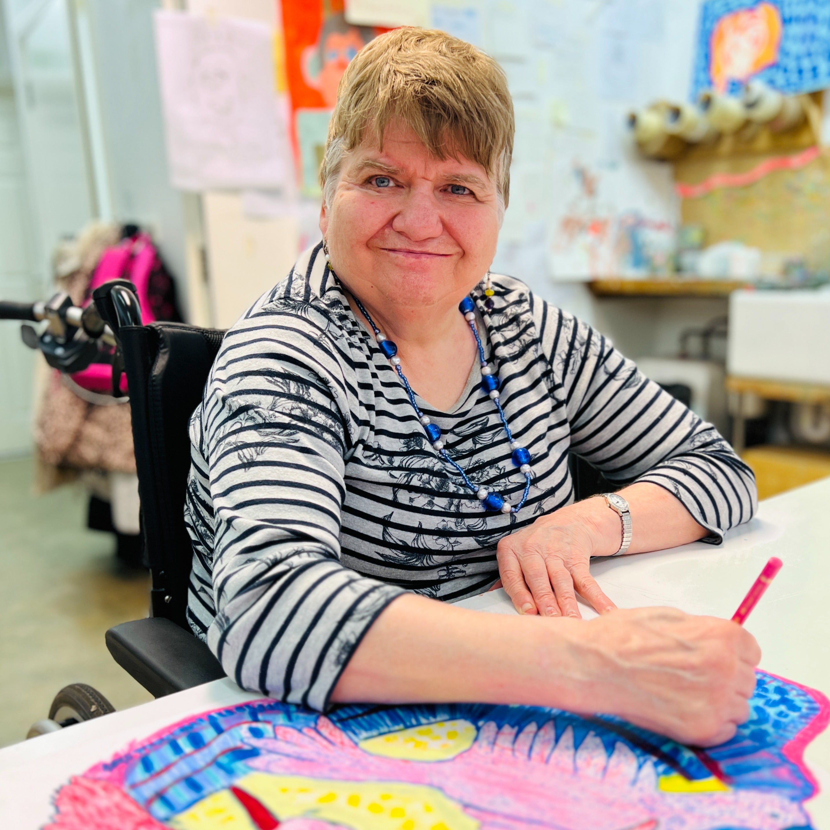 I’ve been coming to ARTHOUSE Unlimited for a long time now, I love it because I like coming up with ideas for cards. I like coming to ARTHOUSE because the people here are friendly, caring, nice and kind. It makes me feel so good when I see my work being sold. I feel really proud of myself at ARTHOUSE Unlimited.