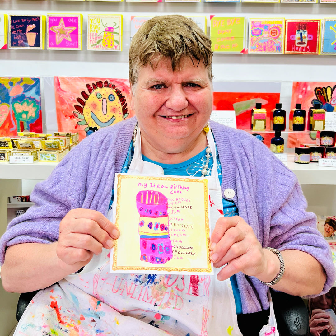 Worthy of a bake-off handshake! A delicious & delightful charity birthday card created by ARTHOUSE Unlimited artist Karen Brown. Now printed with a stunning gold frame, this card is blank inside ready for your own personal birthday best wishes.