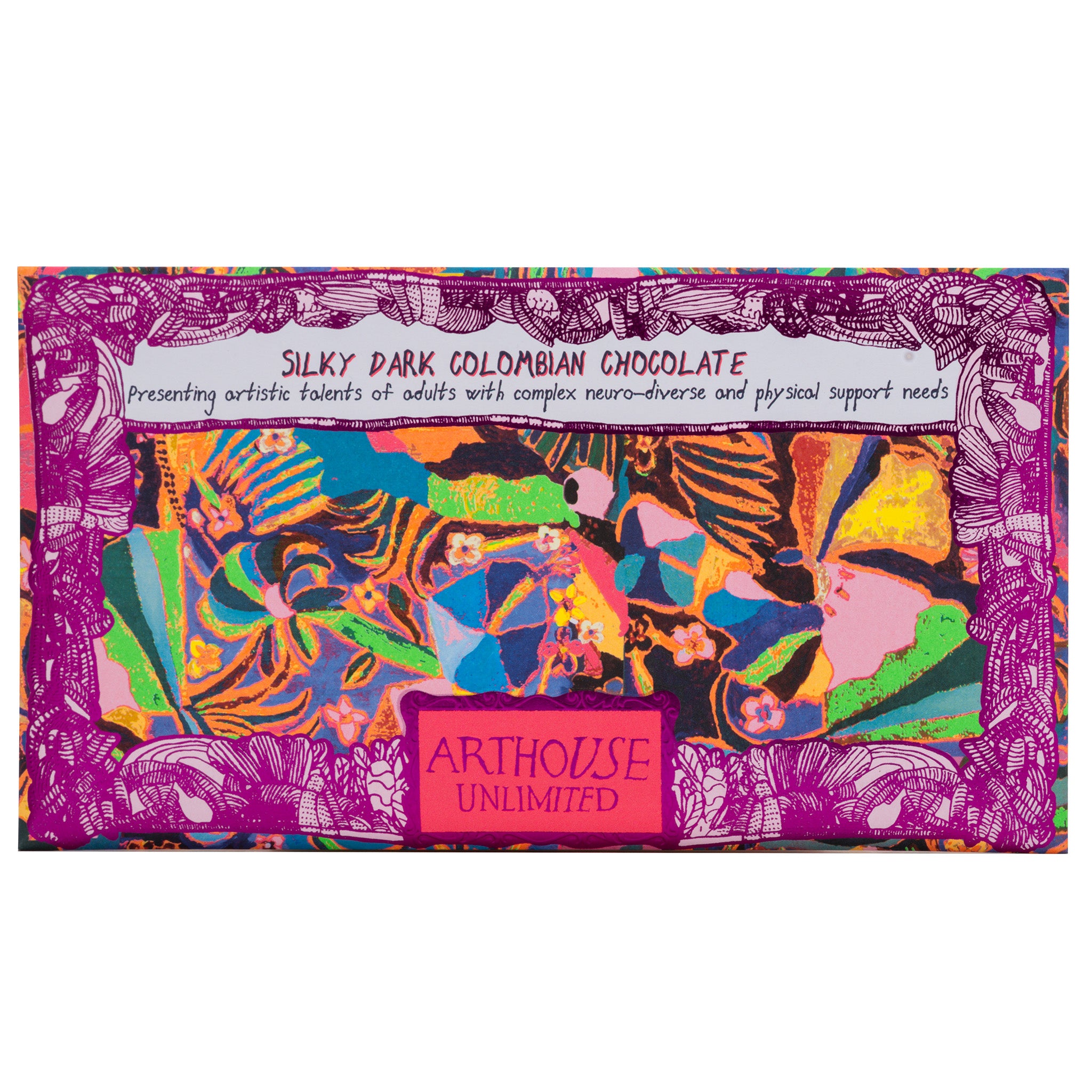 This silky dark Colombian chocolate bar is a delight for dark chocolate connoisseurs everywhere. Made in the UK with responsibly sourced cocoa this bar features Psychedelia, an artwork created by artist Laura Tregellas and presented in a dazzling purple frame. Wrapped in coloured foil & encased in a recyclable envelope. An ideal gift for chocoholics, art lovers & good-cause supporters everywhere!