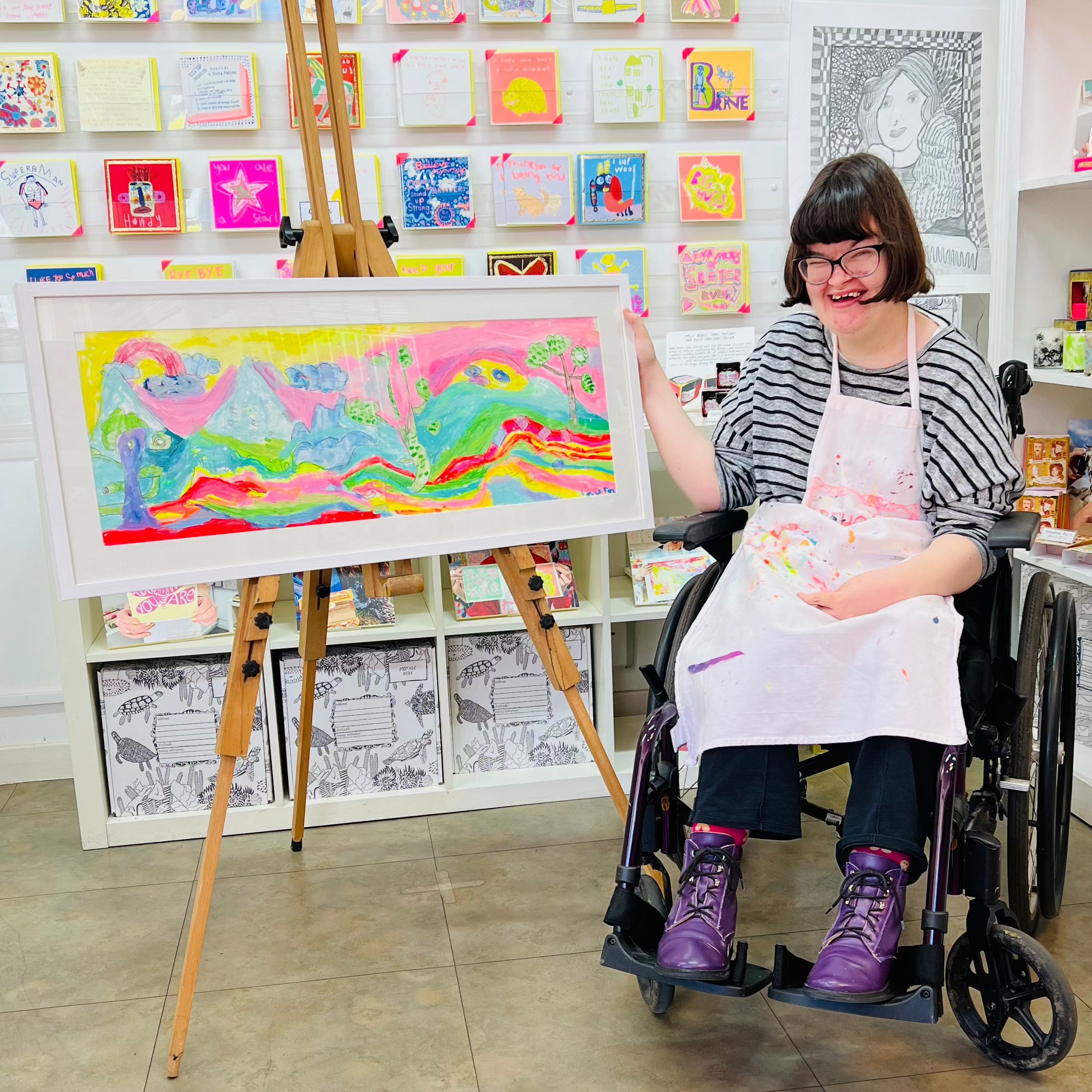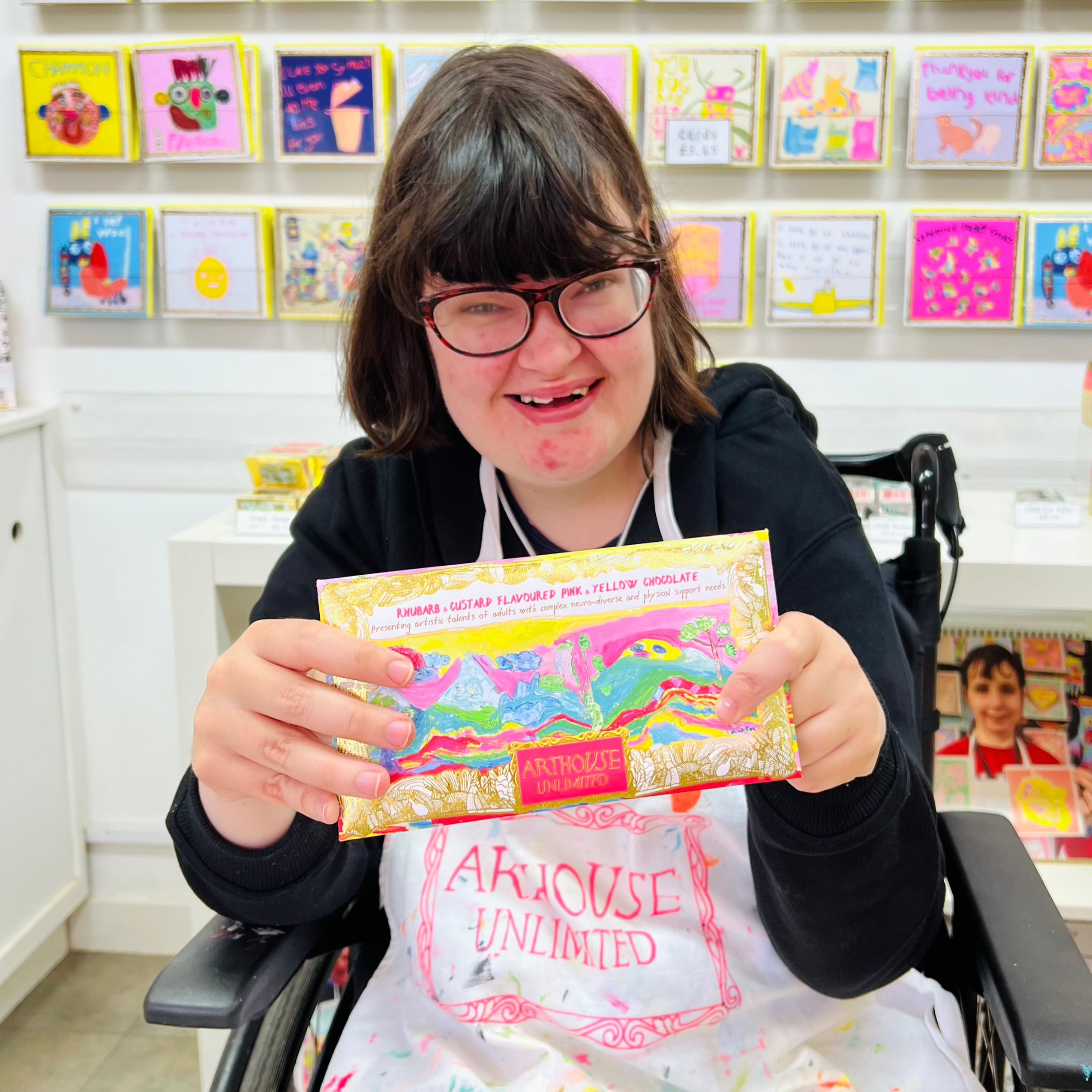 I like to come to Arthouse to create artwork with my friends, it is relaxing and calming. Painting makes me happy, I like abstract landscapes and I’m most proud of my painting ‘Colourful Spring’ I’m excited because it’s going to be made into a chocolate and mug design. It makes me proud to think that people will have gifts with my design on it.