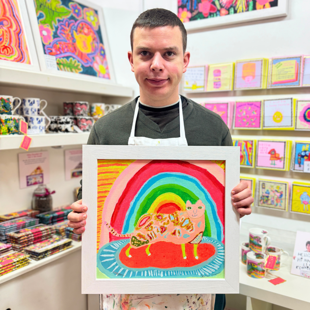 The smiling cat on Stephen Knapman’s eye-catching artwork draws you in with his hypnotic stare! His patterned fur is almost psychedelic, whilst the fluorescent-coloured rainbow transforms to another place!