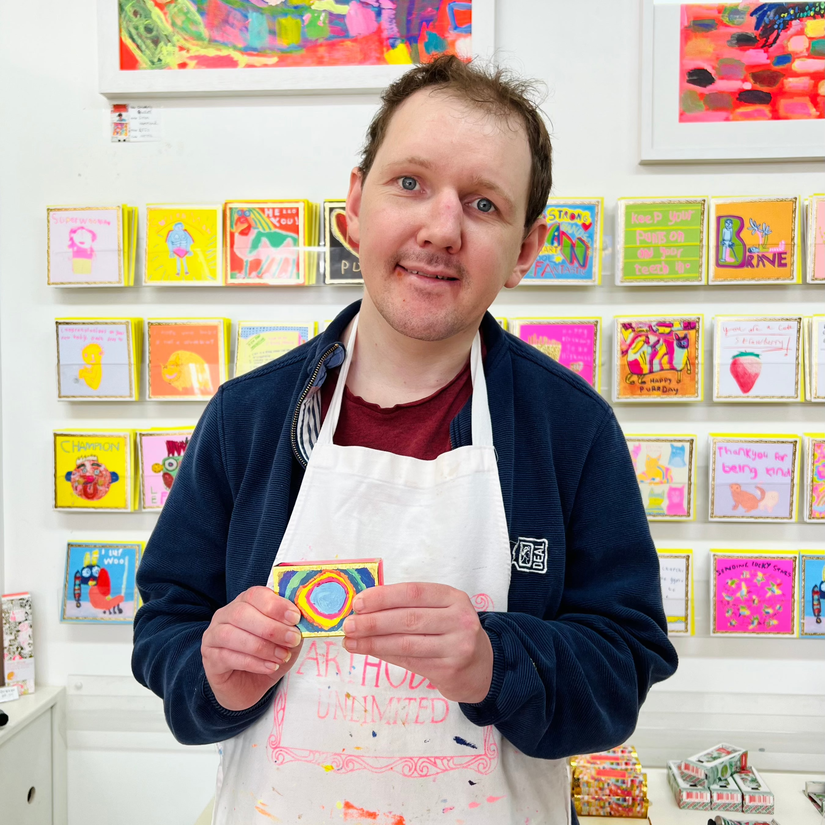 When I come to ARTHOUSE what I like best is working in the shop. I enjoy helping to pack products such as lip balms and cards and welcoming customers who visit us. As well as painting, I love sports. My favourite is snooker and I also like skiing.