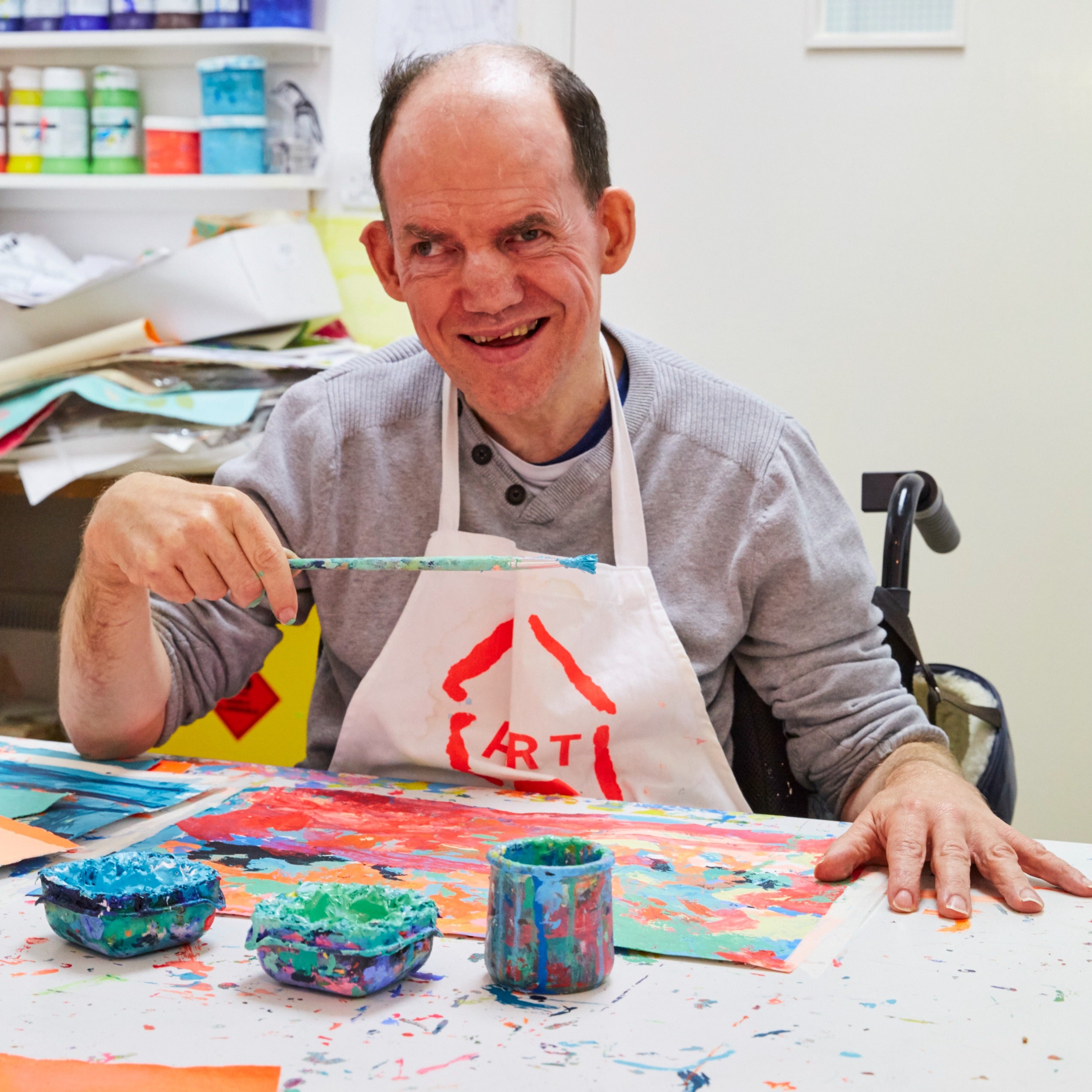 I like coming to ARTHOUSE Unlimited because I like the company of the others in the session. I love coming to paint. My favourite colour is light brown. I feel very proud when someone sees my work. My sister has a picture of mine on the wall, and hopefully many other people do to0. I am so happy here.