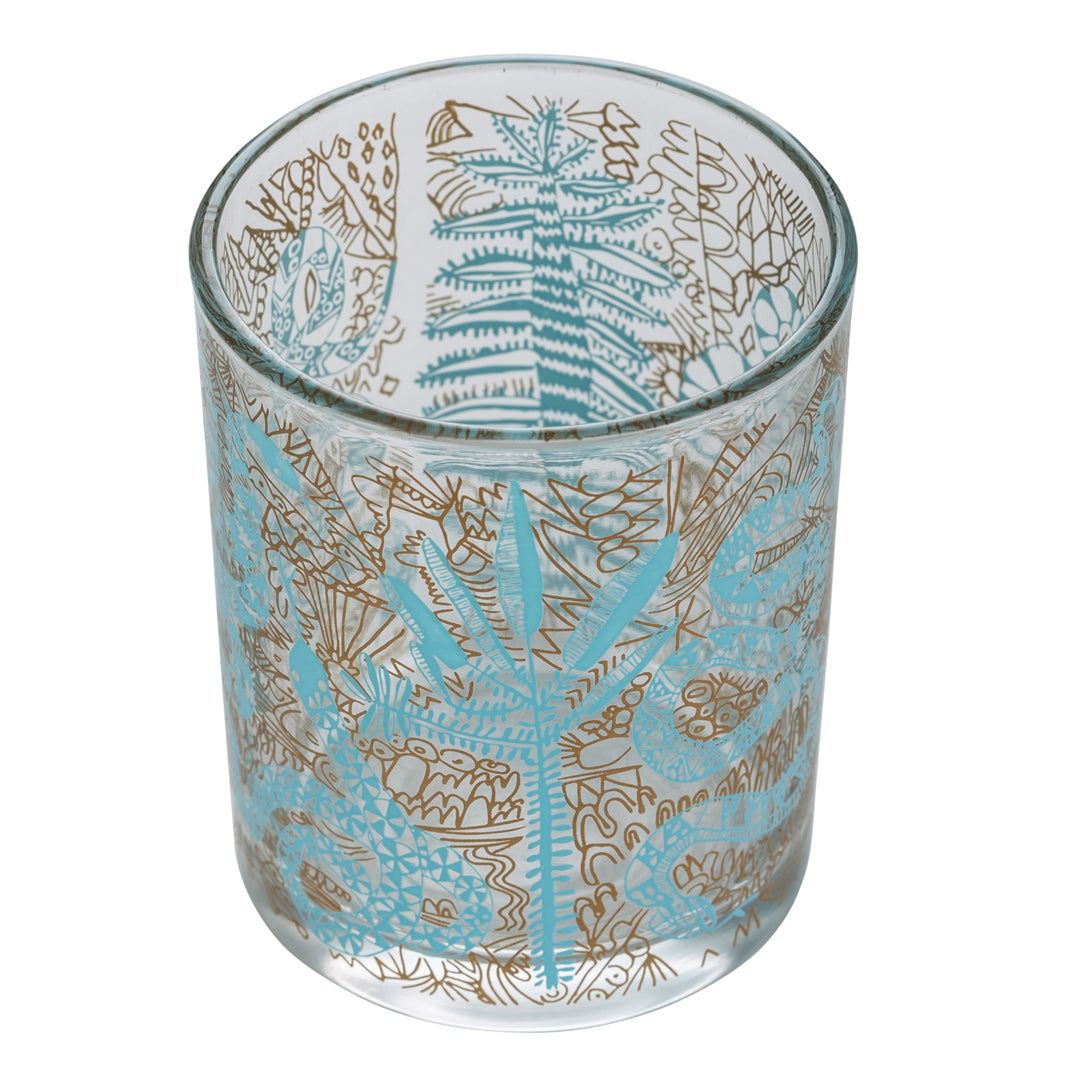 A series of delicately composed snakes and plants provide the design for the enchanted candle glass. Originating from a stunning group work entitled ‘Silly Games’, this painting was completed by a number of different artists, each contributing their own unique painterly style to the finished work.