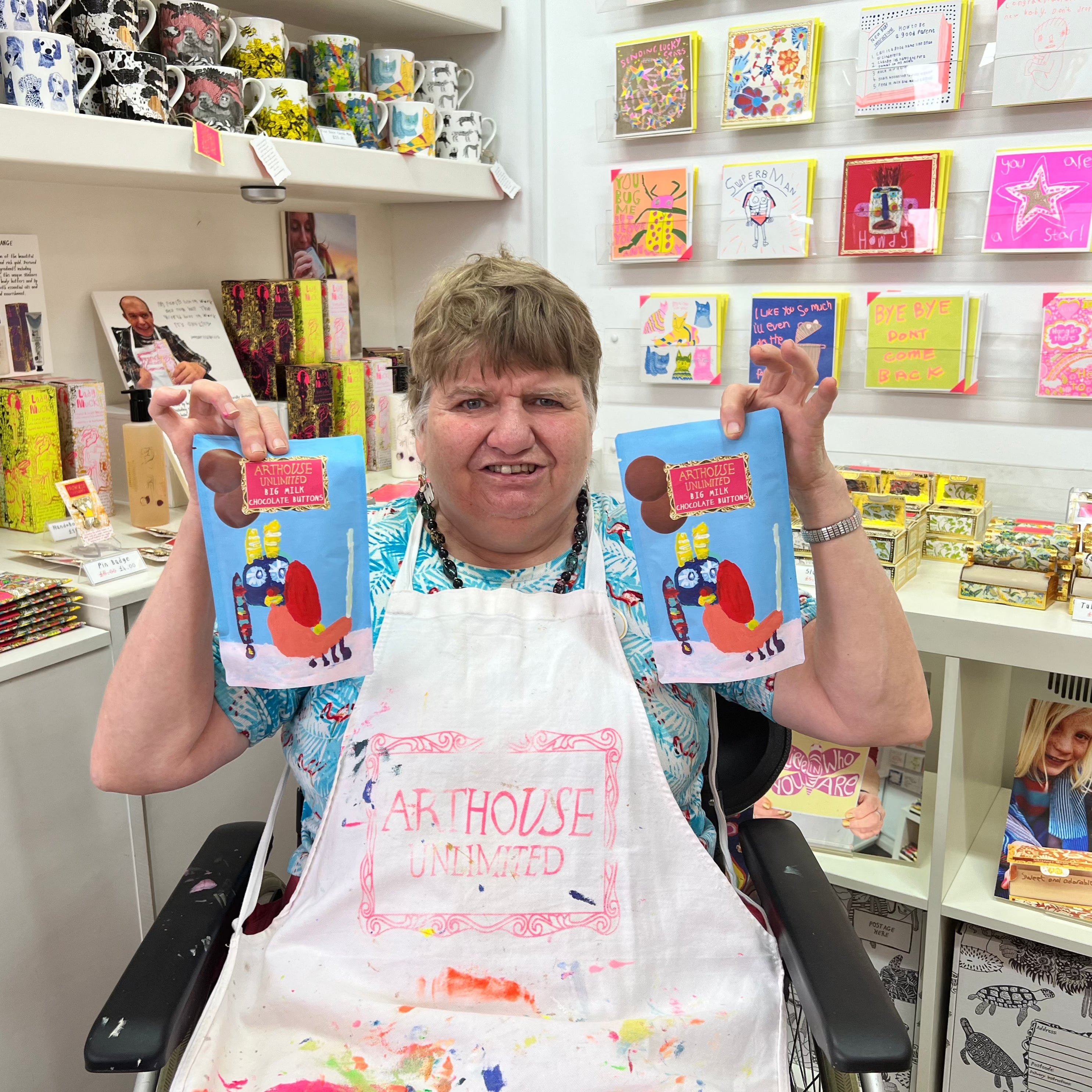 I’ve been coming to ARTHOUSE Unlimited for a long time now, I love it because I like coming up with ideas for cards. I like coming to ARTHOUSE because the people here are friendly, caring, nice and kind. It makes me feel so good when I see my work being sold. I feel really proud of myself at ARTHOUSE Unlimited.