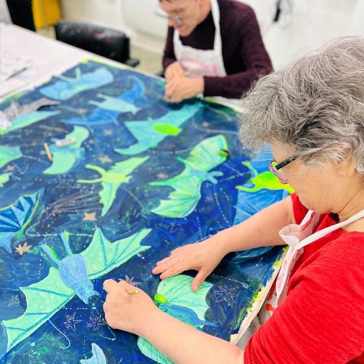 The Bat Mates collaborative artwork was completed by several artists over a number of weeks, each contributing different elements to the overall composition. The individual bats were drawn by different artists and each one has it’s own character with them all brought together against a night sky showing shooting stars and gold accents. The design can be seen on a number of ARTHOUSE Unlimited products.