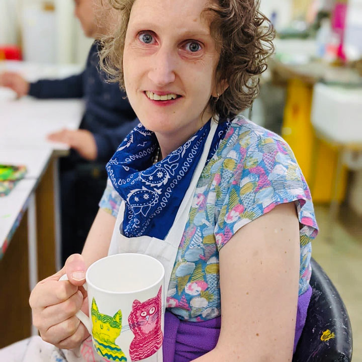 The Miaow for Now artwork was created in the studio over a number of weeks as part of a group work project on cats. A group of artists worked on individual drawings each displaying their own characters, names and personalities. These drawings were then put together to create the wonderful Miaow for Now design, featured across a range of products.