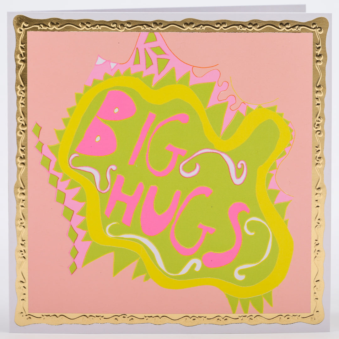 Big Hugs abound in this best wishes charity card. This extra special token of love has been created by ARTHOUSE Unlimited artist Laura Tregellas. Now printed with a dazzling gold frame & blank inside, it's ready for your personal messages full of warmth & care. Just right for get well soon or thinking of you occasions.
