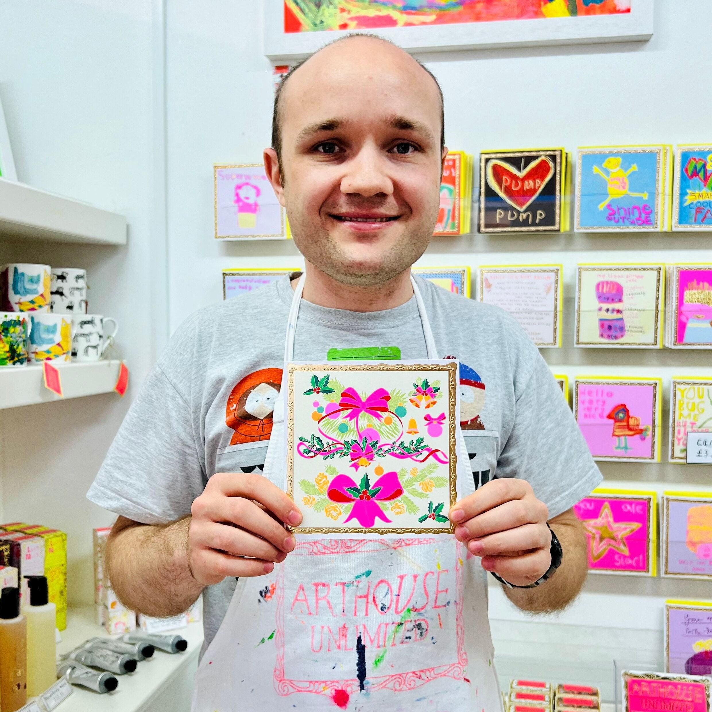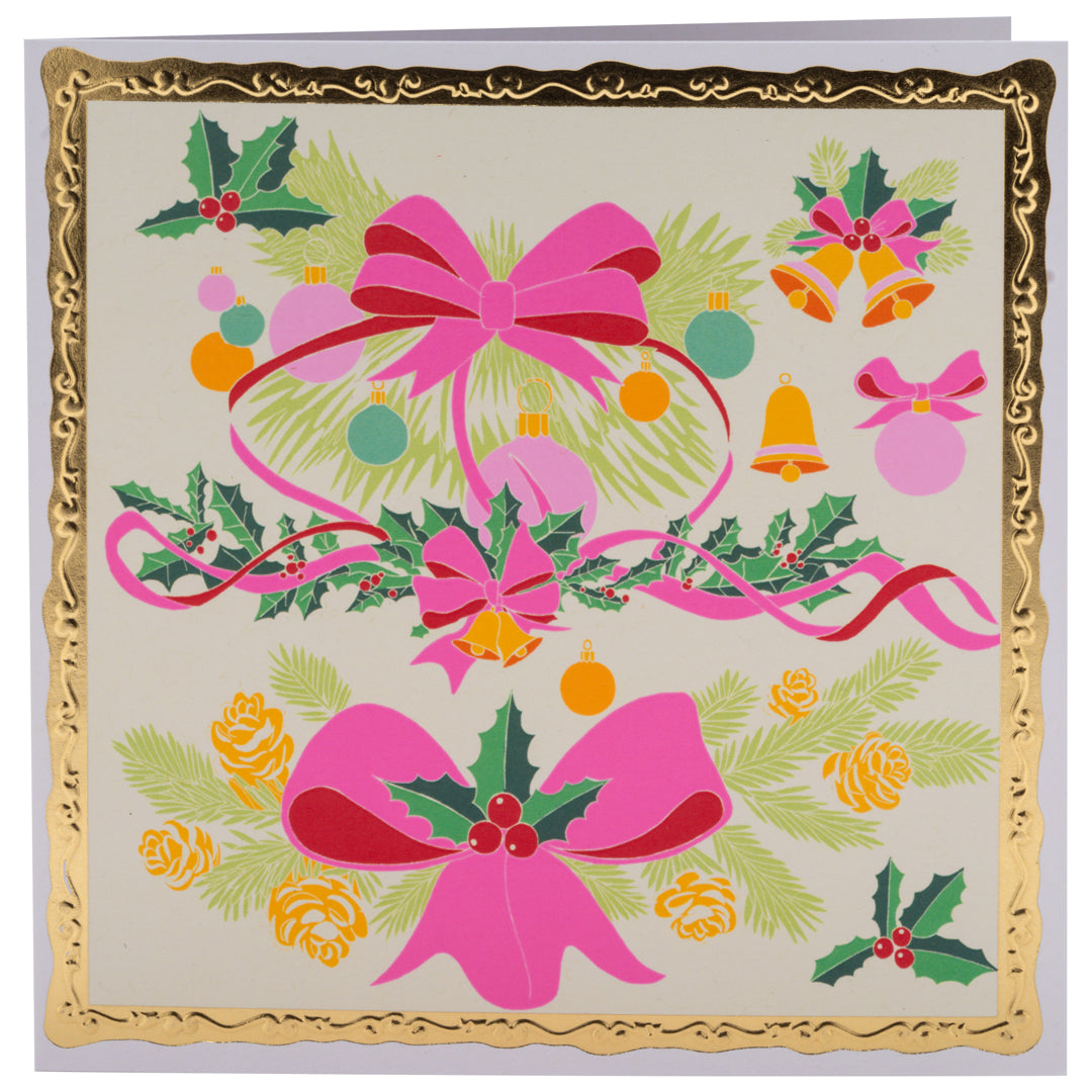 A traditional charity Christmas card in the ARTHOUSE Unlimited style. Artist Jack Churchyard gives us bows and bells and wreaths on this festive card. Blank inside ready for your own Christmas cheer.