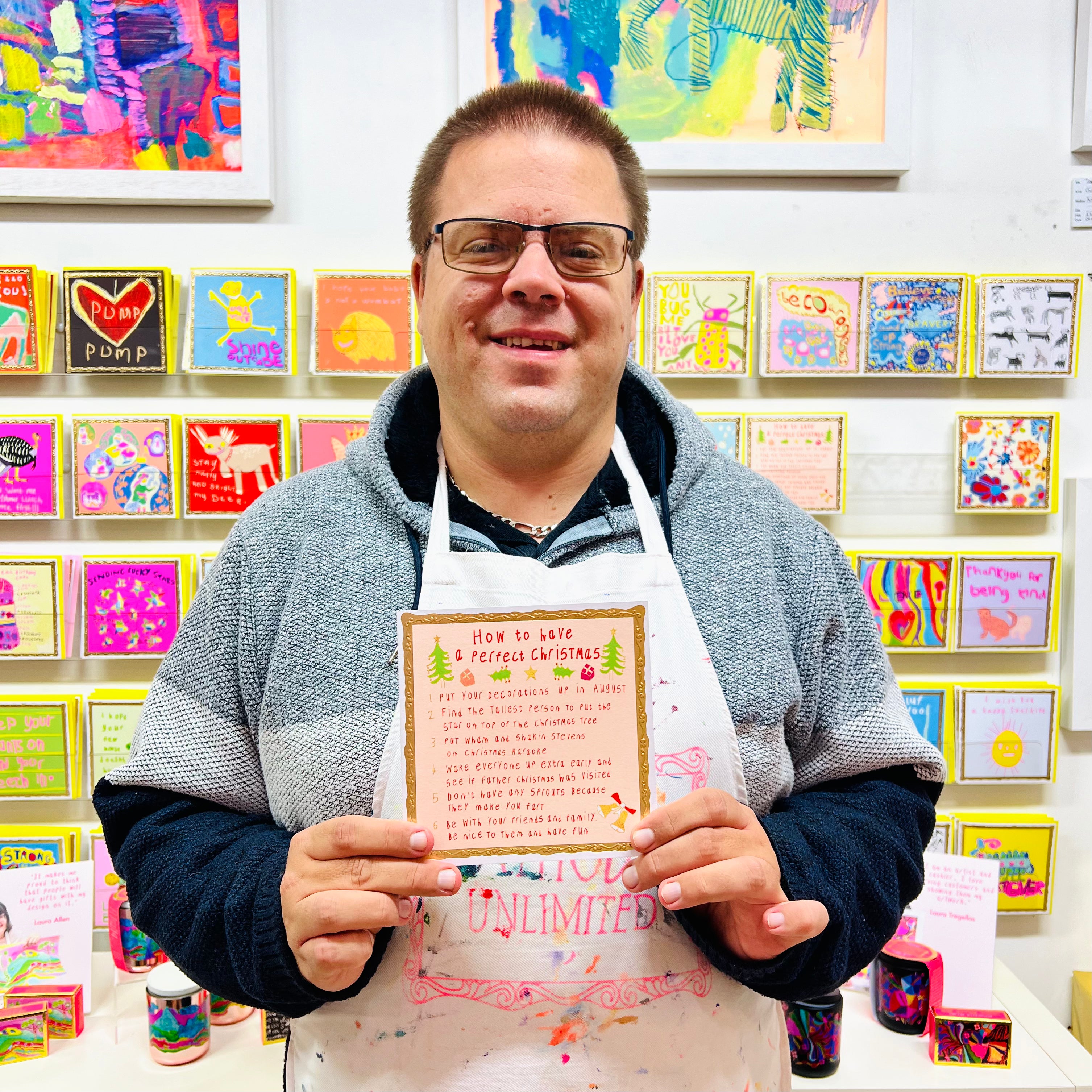 Top tips for a perfect Christmas from the purveyor of good advice, ARTHOUSE Unlimited artist Ben Kennedy. This funny charity Christmas card is blank inside & ready for your own personal message of festive cheer. Sprouts anyone...?